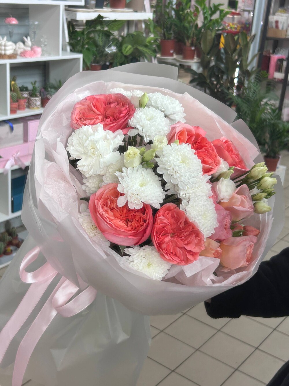 Хризантема 2шт Роза пионовидная 5шт Роза кустовая 1шт Эустома 2шт