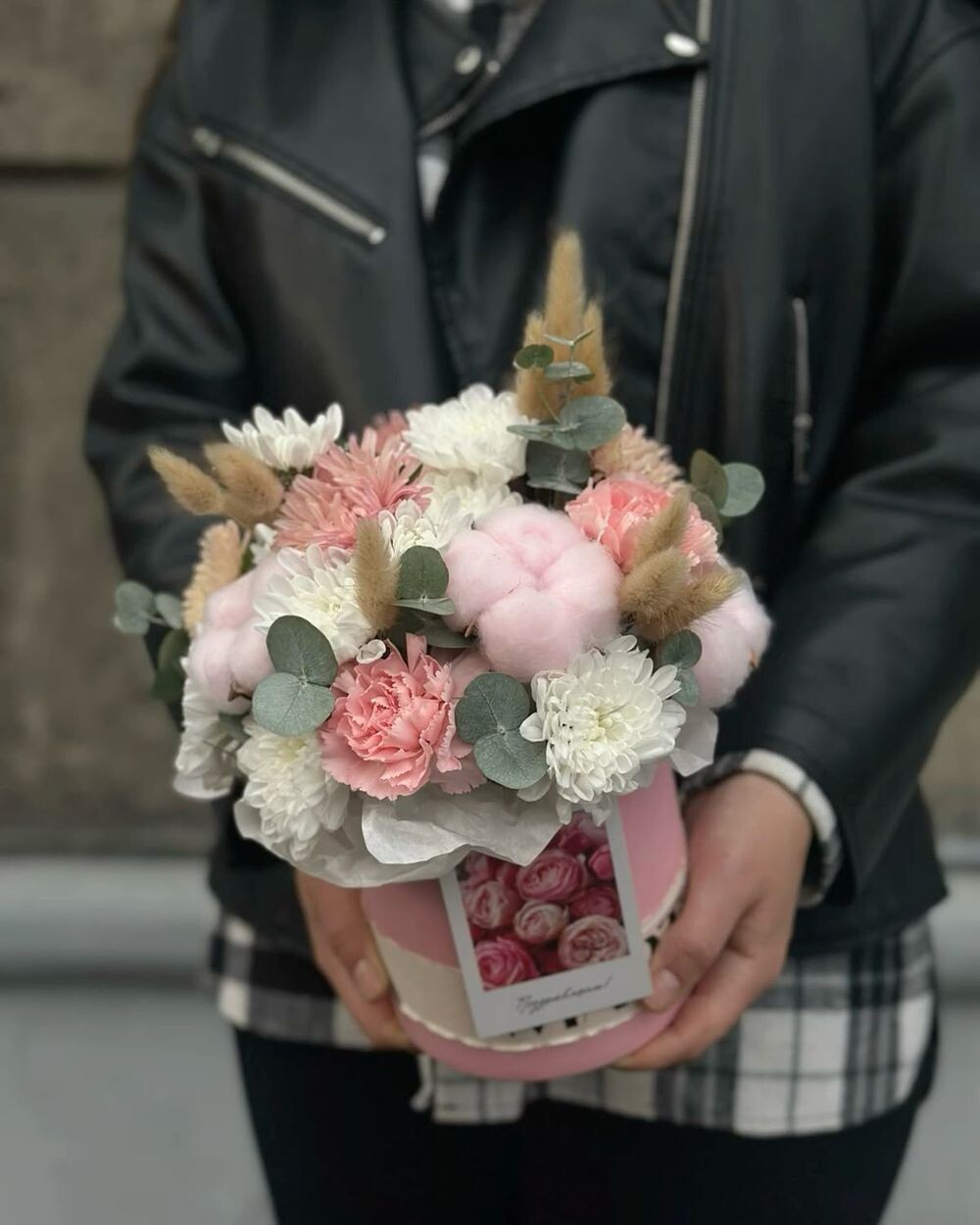Хризантема 2шт диантус 5шт хлопок 3шт сухоцвет эвкалипт 7шт