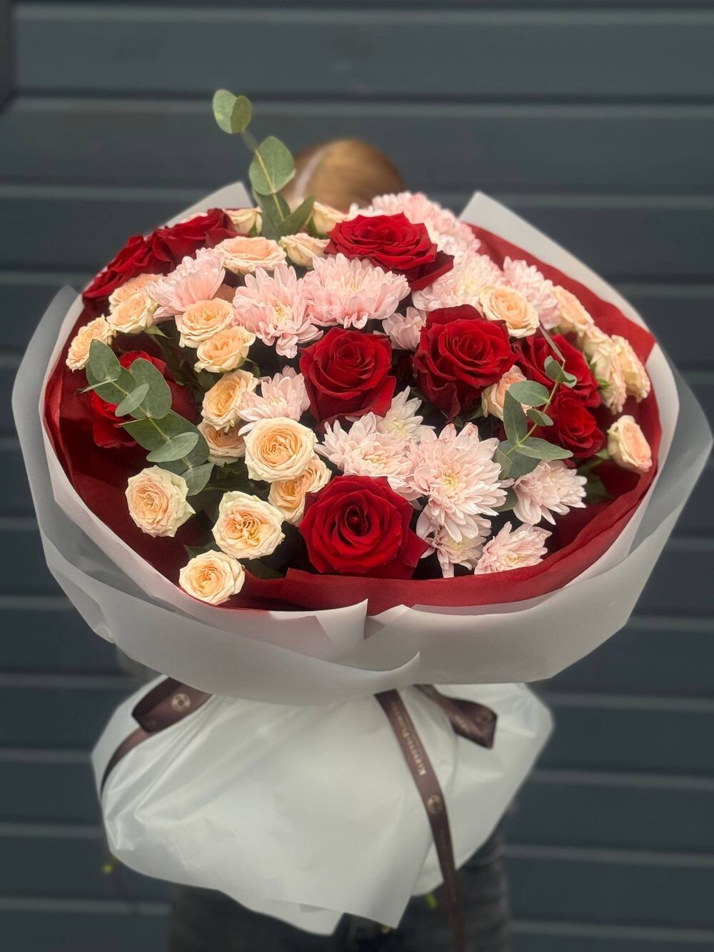 Хризантема 3шт роза кустовая 5шт роза одноголовая 9шт эвкалипт 3шт