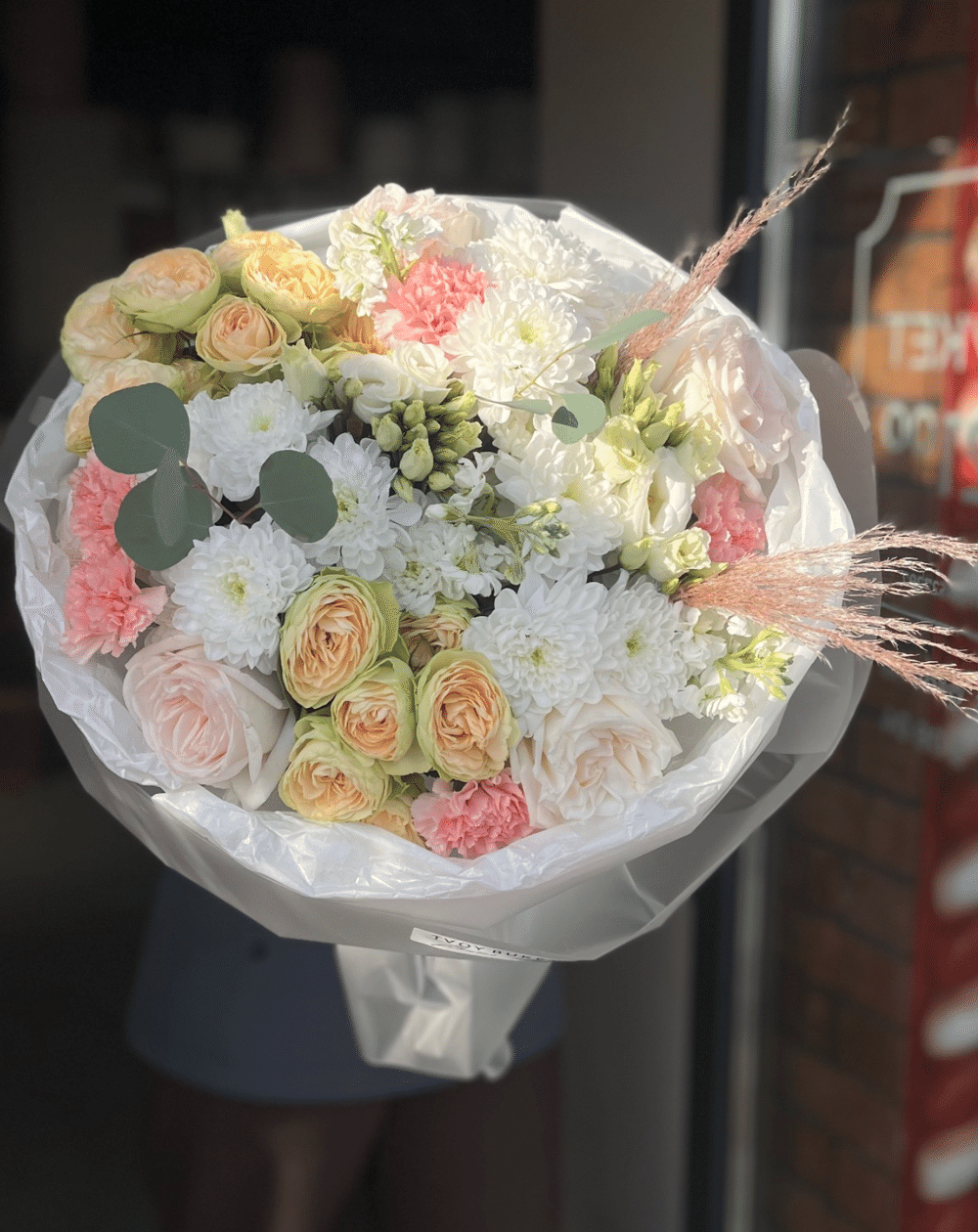 Хризантема 3шт кустовая роза 2шт диантус 5шт роза одноголовая 3шт эустома 1шт эвкалипт 2шт