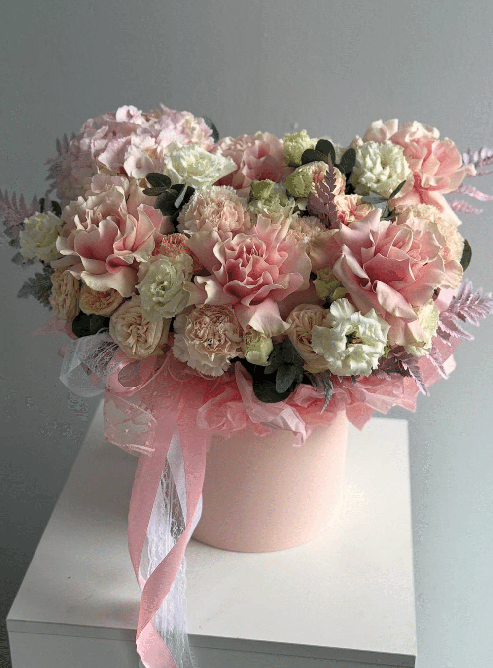 Гортензия 1шт роза французская 5шт диантус 7шт роза кустовая 5шт эустома 3шт эвкалипт 7шт