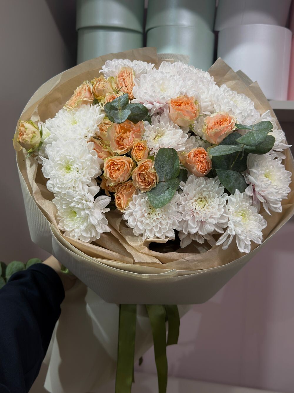 Хризантема 4шт Кустовая Роза 3шт Эвкалипт 3шт