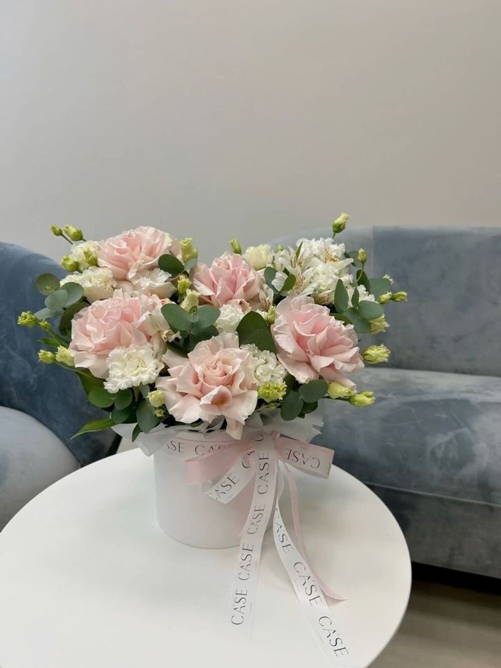 Французская роза 5шт эустома 5шт альстромерия 3шт эвкалипт 9шт коробочка