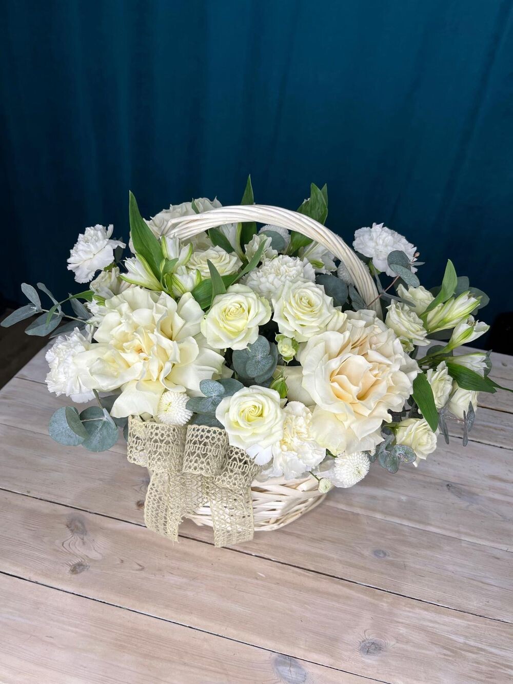 Роза французская 3шт роза кустовая 5шт альстромерия 3шт диантус 7шт хризантема 2шт эвкалипт 7шт
