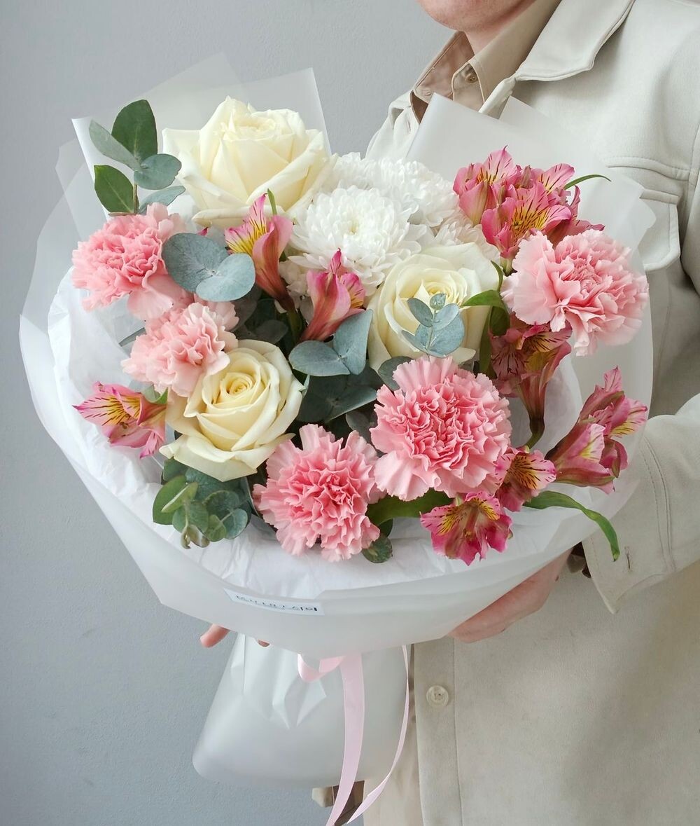 Хризантема 1шт альстромерия 4шт роза одноголовая 3шт диантус 5шт эвкалипт 5шт