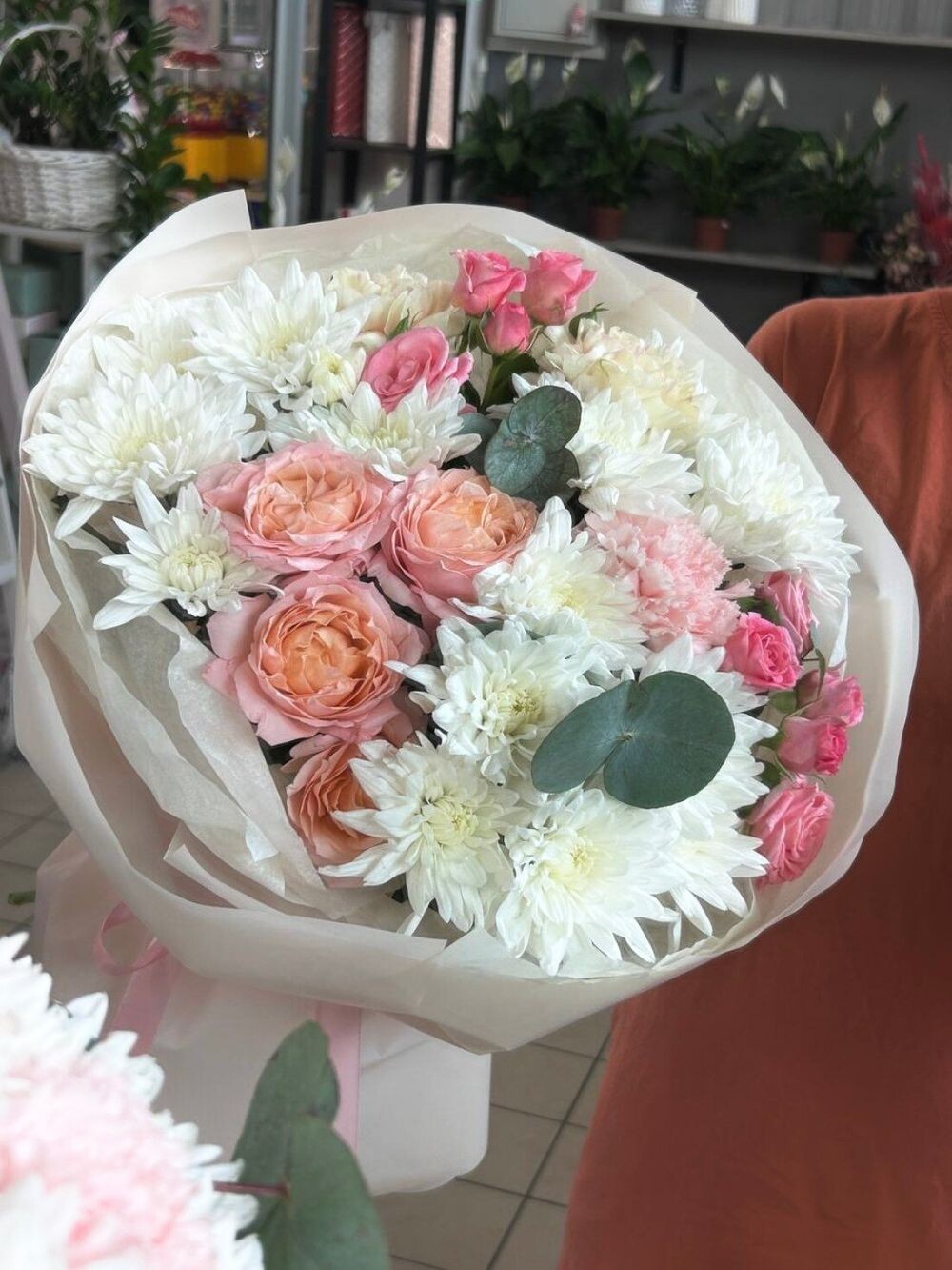 Хризантема 3шт Кустовая Роза 3шт Диантус 1шт Эвкалипт 1шт