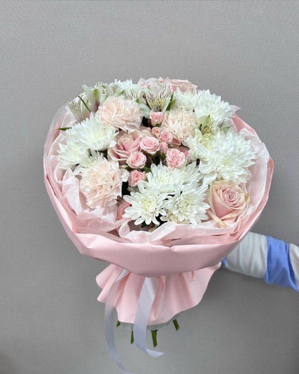 Хризантема-3 шт. Кустовая роза-1 шт. Диантус-3 шт. Роза одноголовая-3 шт. Альстромерия-3 шт