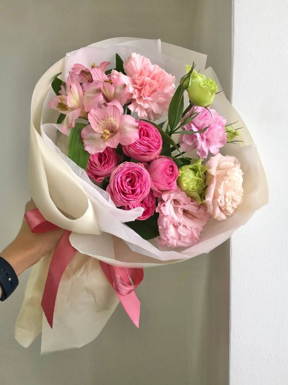 Роза кустовая-1 шт. Альстромерия-1 шт. Диантус-2 шт Эустома-1 шт.