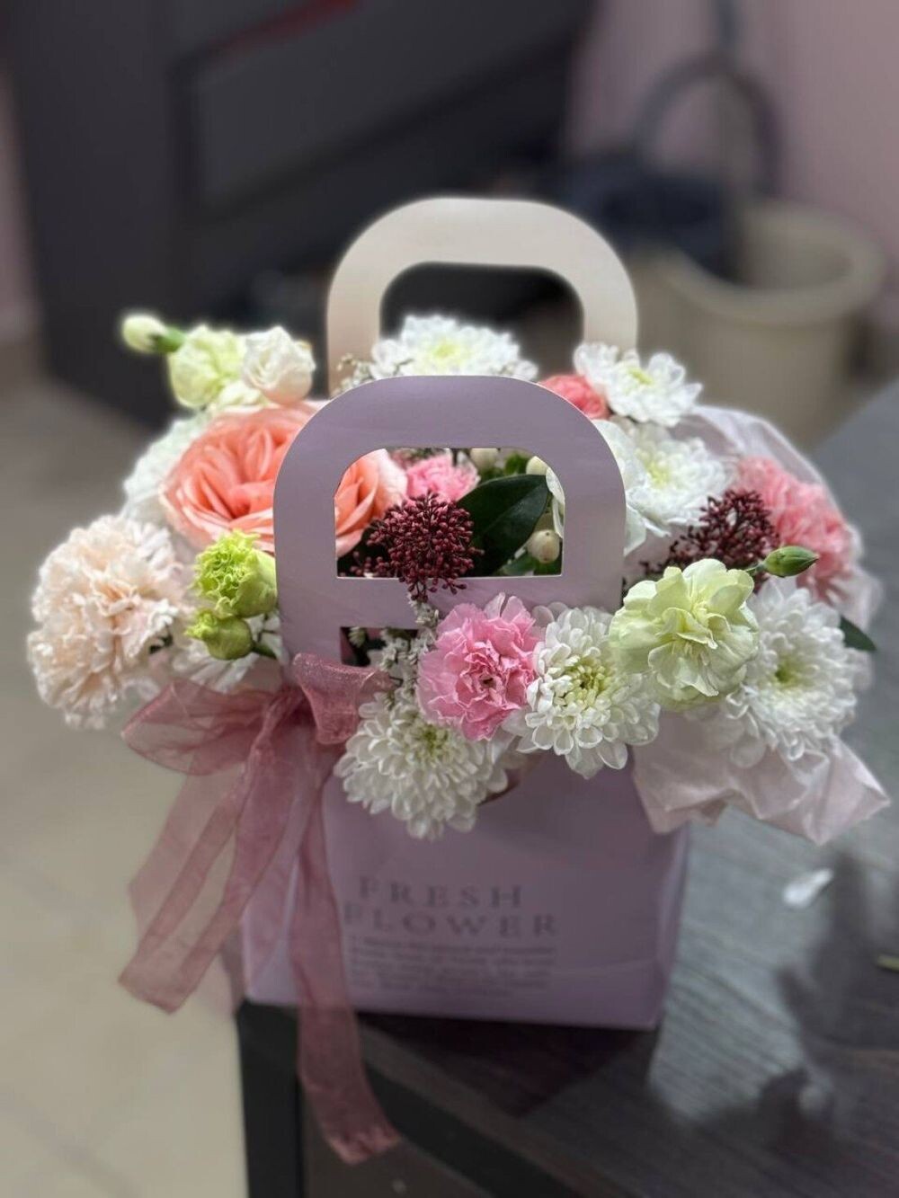 Роза-2 шт. Гвоздика-3 шт. Хризантема-3 шт. Эустома-3 шт. Сумочка-1 шт.
