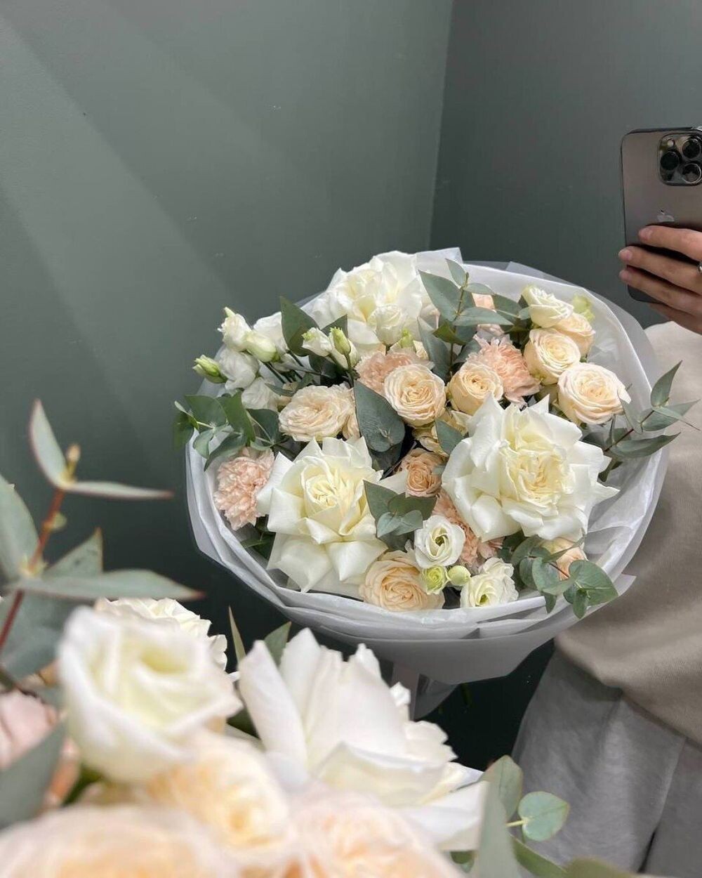 Роза французская-3 шт. Роза кустовая-3 шт. Диантус-5 шт Эустома-5 шт. Эвкалипт-7 шт.