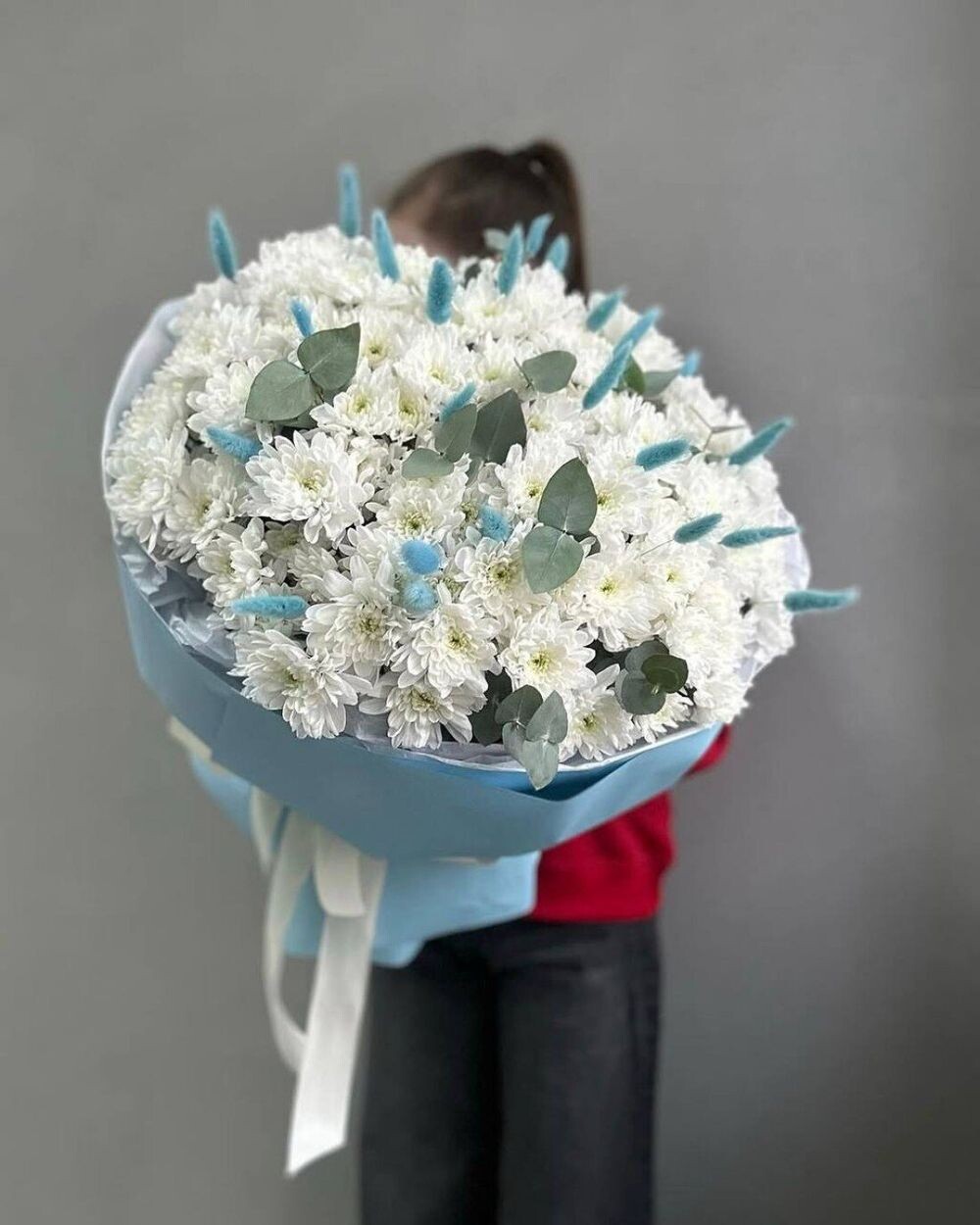 Хризантема-11 шт. Сухоцвет лагурус -25 шт. Эвкалипт-5 шт.