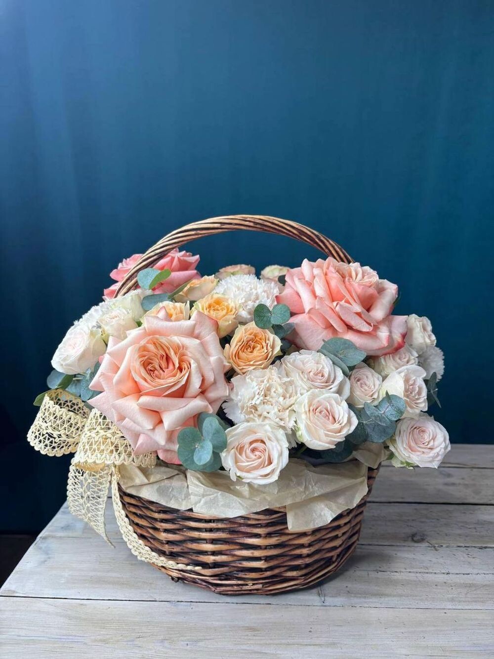 Роза одноголовая 3шт Роза кустовая 5шт Диантус 5шт Эвкалипт 10шт Корзина