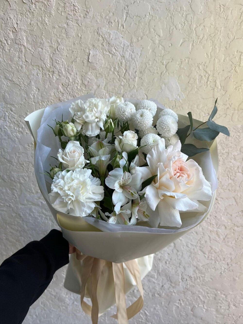 Роза французская -1шт альстромерия - 2шт диантус -2шт роза кустовая -1шт хризантема ньютон -1шт эвкалипт -1шт
