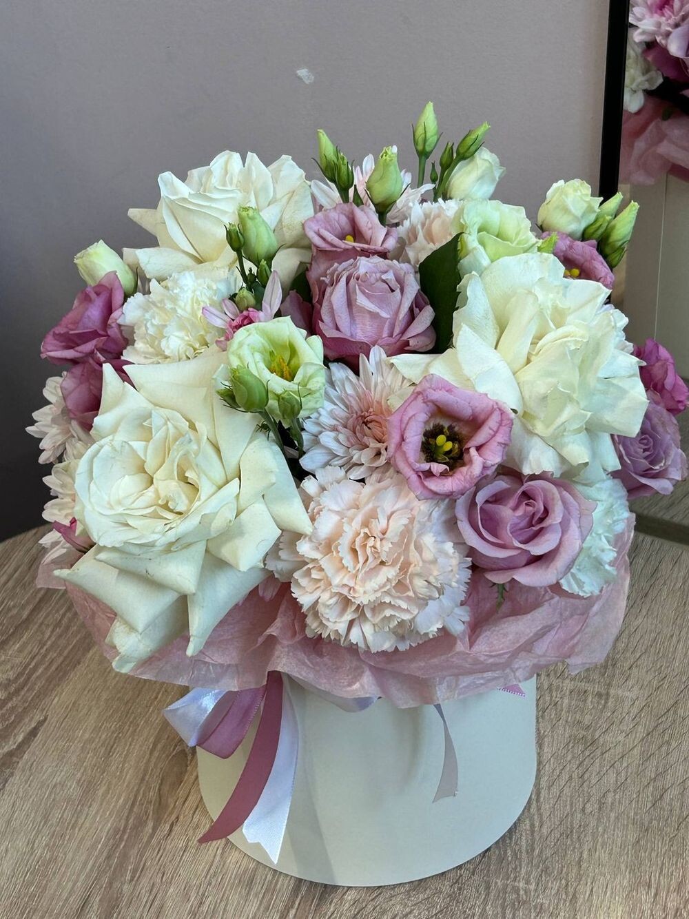 Французская Роза 3шт Эустома 3шт Хризантема 2шт Диантус 3шт Коробочка