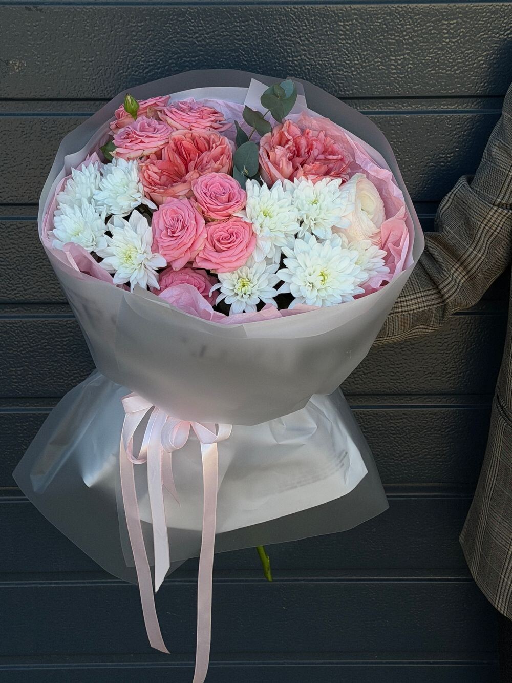 Роза кустовая 2шт Эвкалипт 1шт Хризантема 2шт Роза пионовидная 2шт Диантус/роза 1шт