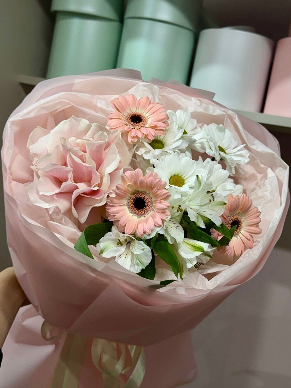 Роза французская 1шт Хризантема ромашка 1шт Альстромерия 1шт Гербера мини 3шт/ Гербера 1шт