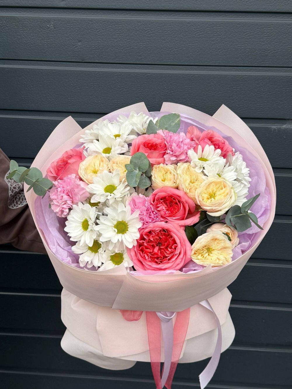Роза пионовидная 5шт Роза кустовая 2шт Ромашка 3шт Диантус 3шт Эвкалипт 4шт