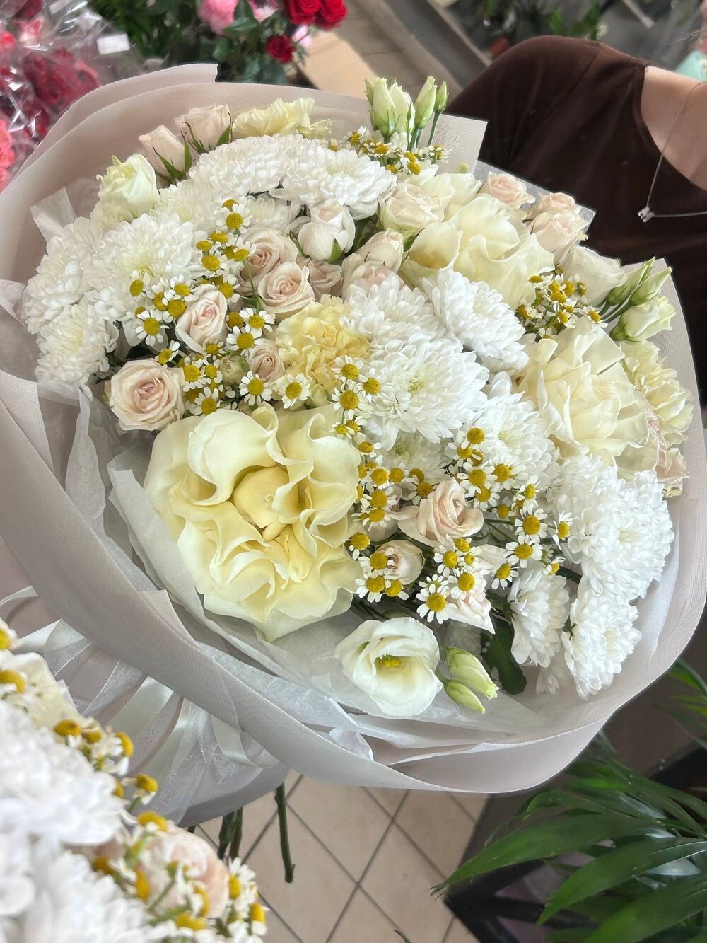 Хризантема 4шт Роза французская 3шт Эустома 3шт Роза кустовая 5шт